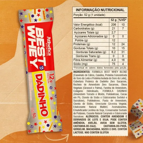 FÓRMULA BEST WHEY BLEND [Caseinato de Calcio, Caseína, Concentrado de Proteína de Suero y Aislado de Proteína de Suero], Relleno de Caramelo Sin Azúcar, Aceites Vegetales (Girasol y Palma), Cristales de Caramelo Crispy Zero Sugar (Maltitol y Polidextrosa), Hidrolizado Péptidos de colágeno, Copos de arroz crujientes, Polidextrosa, Cloruro de sodio, Humectante de glicerina, Edulcorantes de maltitol y sucralosa, Emulsionante de lecitina de soja, Aromas, Conservante de sorbato de potasio y Colorante Natural Caramelo. “NO CONTIENE GLUTEN.” ALÉRGENOS: CONTIENE DERIVADOS DE LECHE Y SOJA. PUEDE CONTENER MANÍ, ALMENDRAS, AVELLANAS, AVENA SIN GLUTEN, ANACARDOS, NUEZ DE BRASIL, SÉSAMO, NUECES Y HUEVO. CONTIENE LACTOSA.