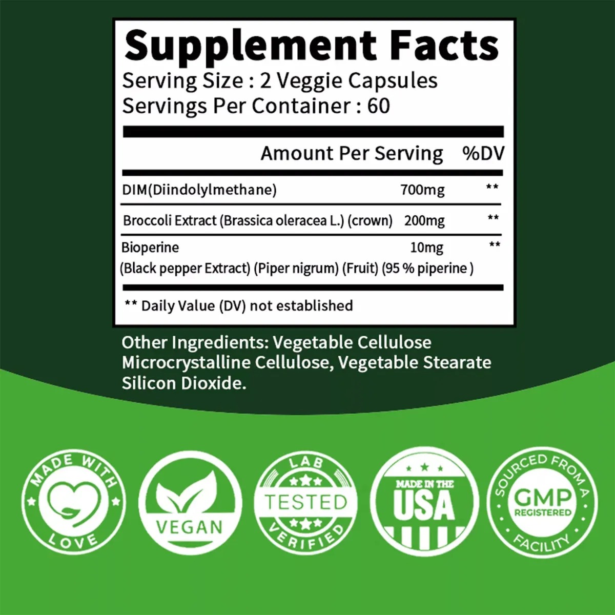 Con Bioperine®: Aumenta la biodisponibilidad y absorción del DIM para resultados más efectivos.