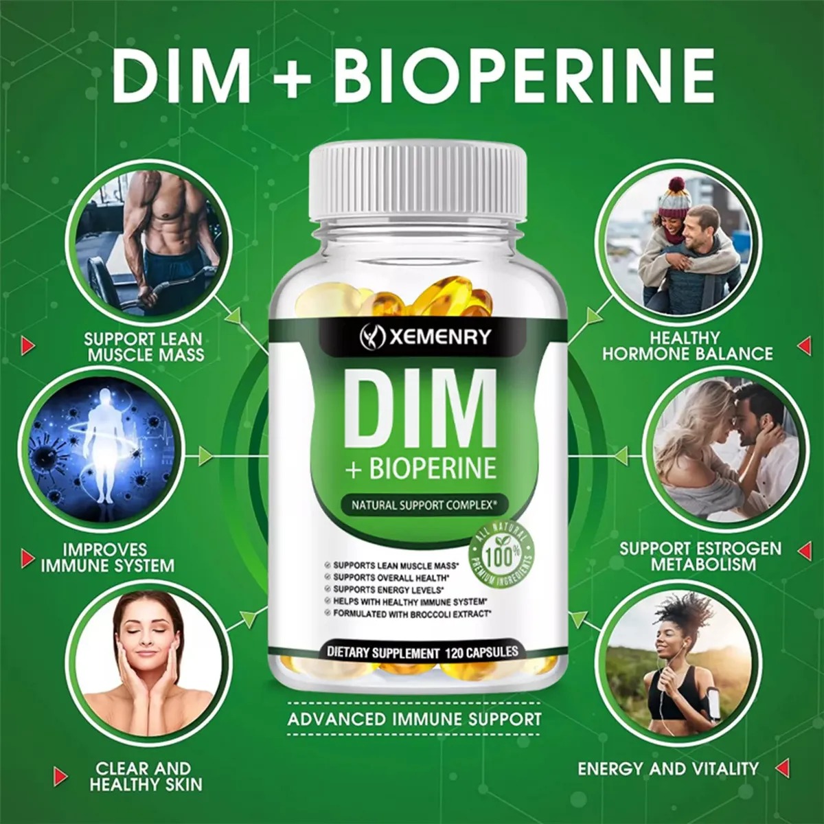 El DIM (Diindolylmethane) es un compuesto natural derivado de los vegetales crucíferos como el brócoli, conocido por su capacidad para favorecer el equilibrio hormonal tanto en hombres como en mujeres. Combinado con extracto de brócoli y Bioperine® (extracto de pimienta negra que mejora su absorción), este suplemento potencia sus beneficios y ofrece un apoyo integral para tu bienestar.