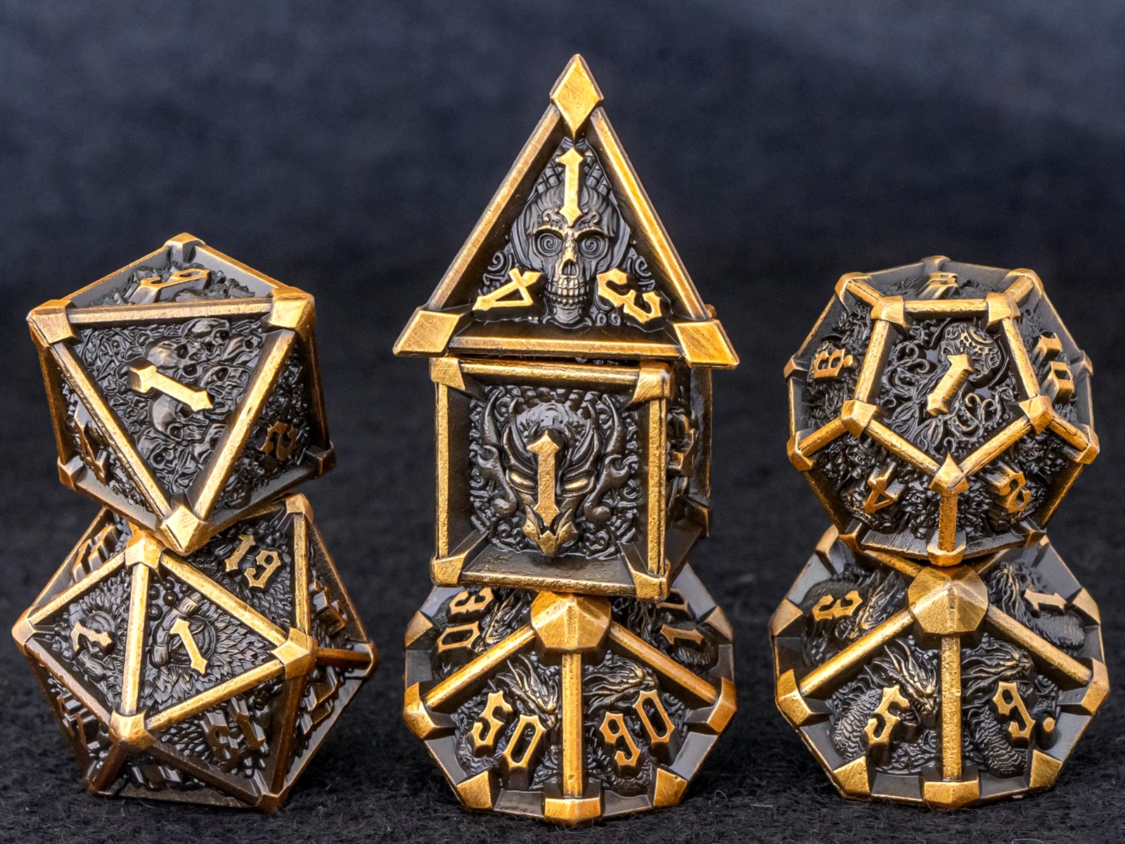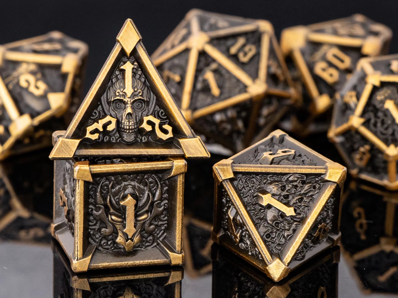 - Calidad Superior: Cada uno de los 7 dados está fabricado en metal y presenta un diseño único con grabados de calaveras en cada cara, aportando una estética oscura y atractiva.